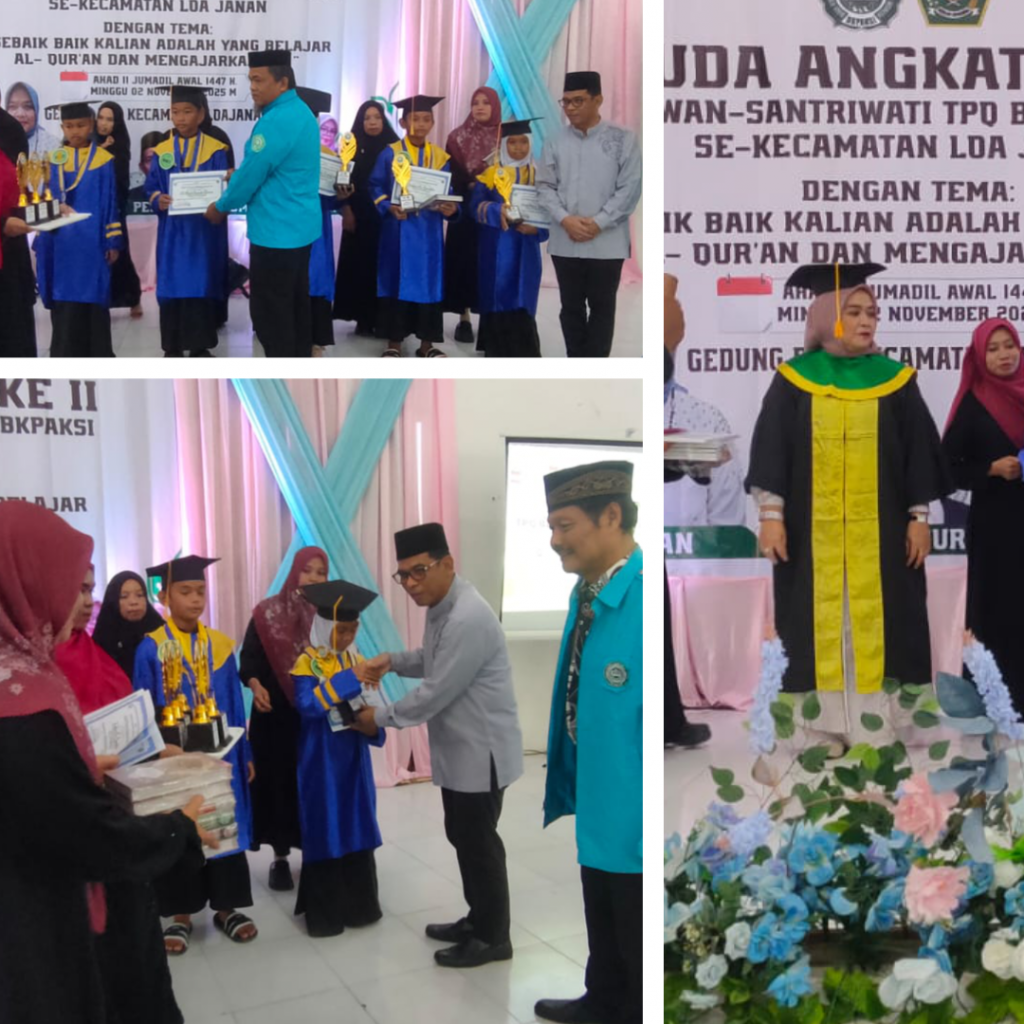 Loa Janan, 2 November 2025 – Suasana penuh haru dan kebanggaan menyelimuti Gedung Balai Pertemuan Umum Kantor Camat Loa Janan saat pelaksanaan Wisuda Angkatan II Santri Binaan BKPAKSI (Badan Koordinasi Pembinaan Anak dan Keluarga Sakinah Indonesia). Acara ini dihadiri langsung oleh Camat Loa Janan, Drs. Hery Rusnadi, yang memberikan dukungan penuh terhadap pembinaan generasi Qur’ani di Kecamatan Loa Janan.